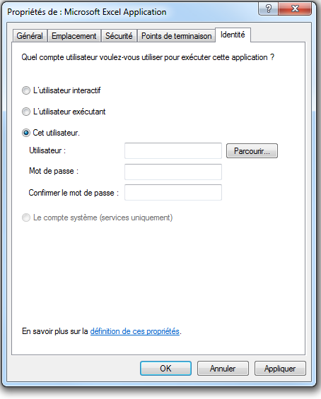 - Sur « Microsoft Excel Application » faites clic droit « propriétés », dans la fenêtre sélectionnez l’onglet « Identité »