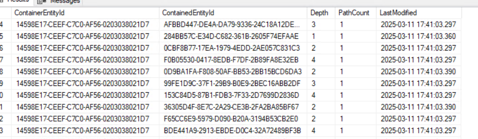 Comme son nom l’indique, cette table contient de manière récursive tous les objets contenus dans un autre objet ainsi que leurs descendants, avec une indication de la profondeur (Depth) d’appartenance: